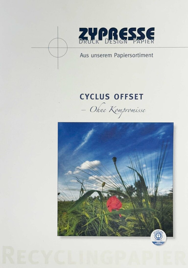 Das Papier Cyclus Offset vereint ökologisches Bewusstsein mit einzigartigem Papiercharakter. Durch den Einsatz dieses Papier müssen in der Kommunikation ab sofort keine Kompromisse mehr eingegangen werden. Das aus 100% Altpapierfasern hergestellte Sortiment spiegelt nicht nur das Umweltbewusstsein des Absenders wider, sondern verfügt zugleich über besondere visuelle und haptische Anmutung und erfüllt hohe Qualitätsansprüche.
