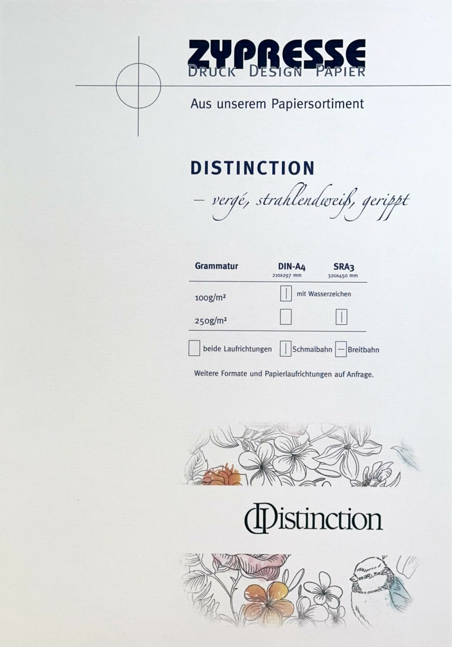 Distinction ist ein dezent geripptes Papier, dass mit seiner weiße besticht. Beim 100g Papier sogar mit Wasserzeichen.