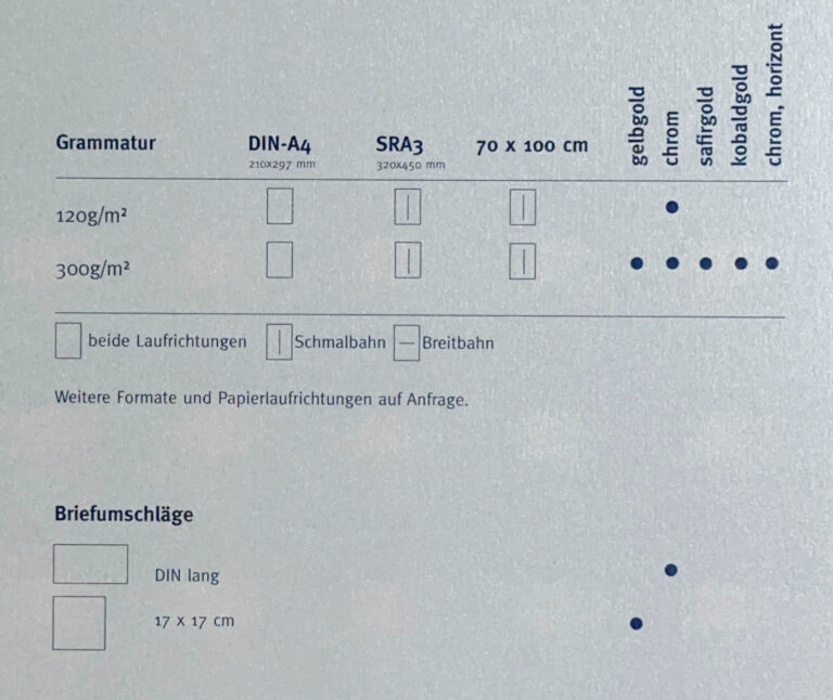Das glatte Papier läßt sich gut im Laserdrucker und Kopierer bedrucken. Wir empfehlen zu testen! Das Programm wird durch Hüllen und Karten in mehreren Formaten abgerundet.