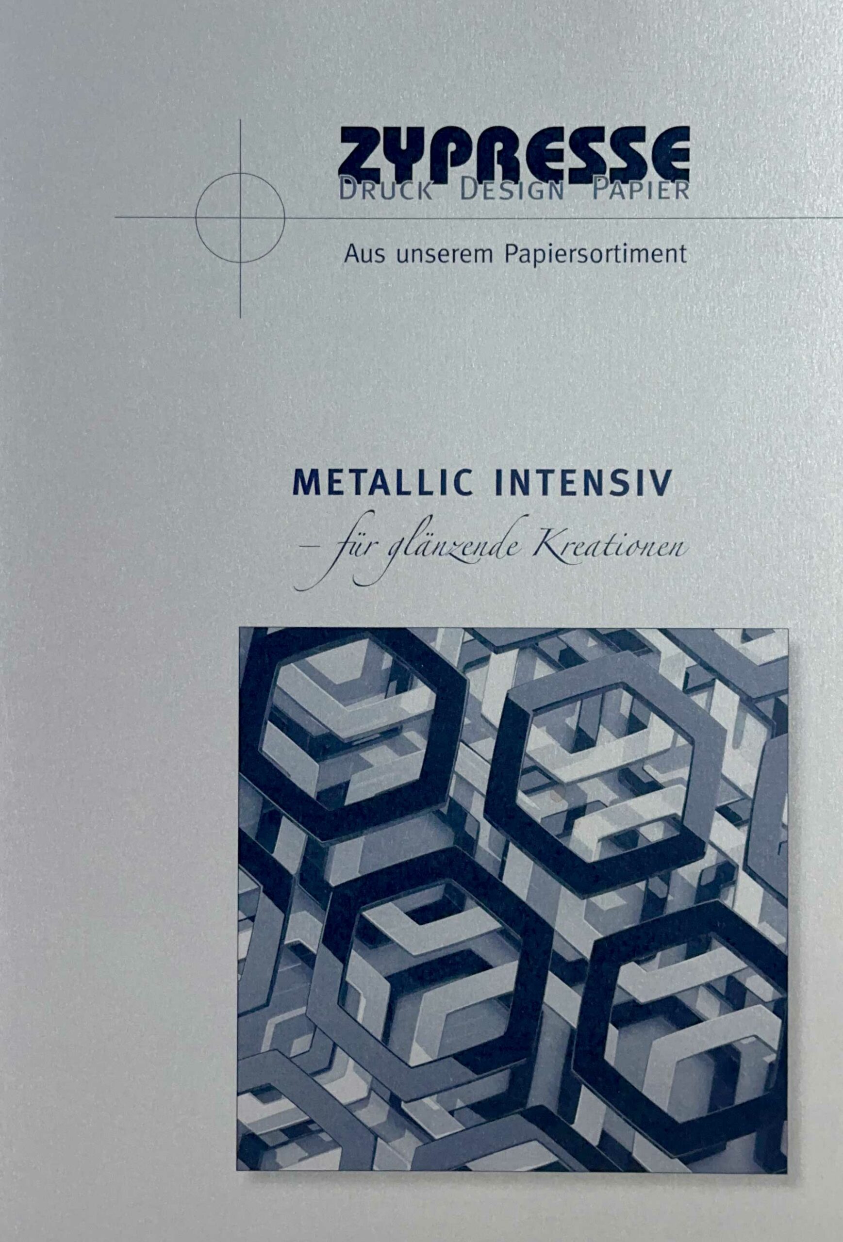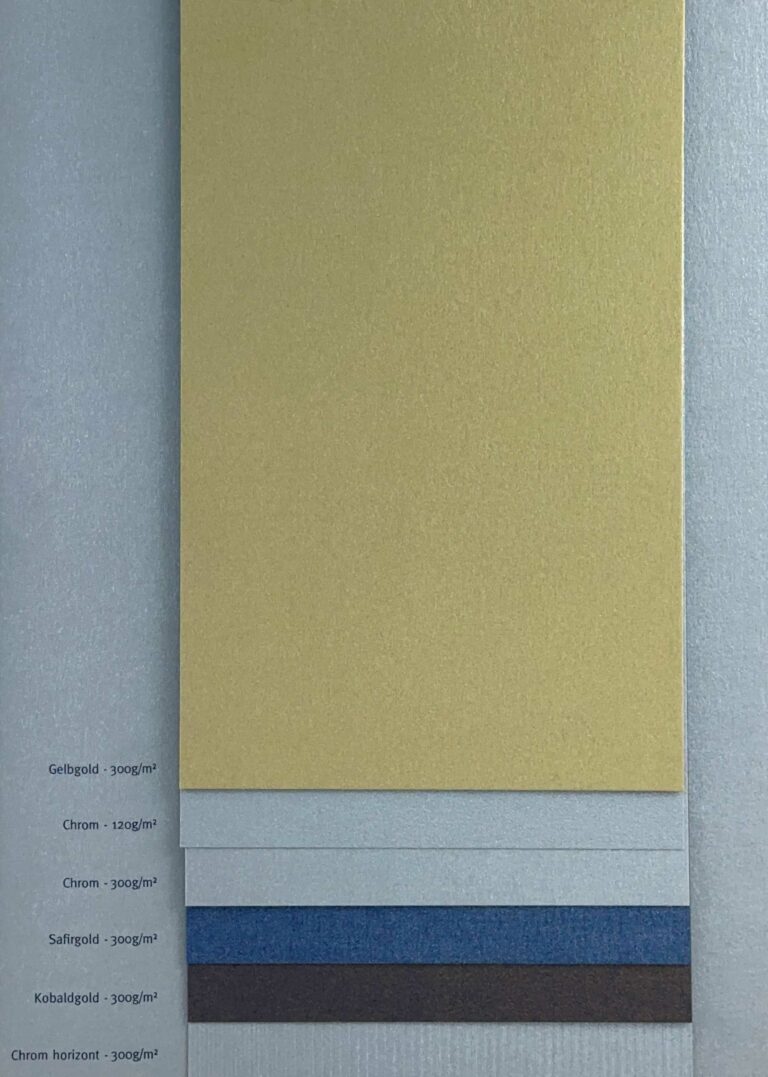 Feinpapier mit metallisch glänzender Oberfläche. Der metallische Schimmer wird durch eine feine Struktur verstärkt. Das Papier hat einen festen Griff. Es fühlt sich angenehm an.